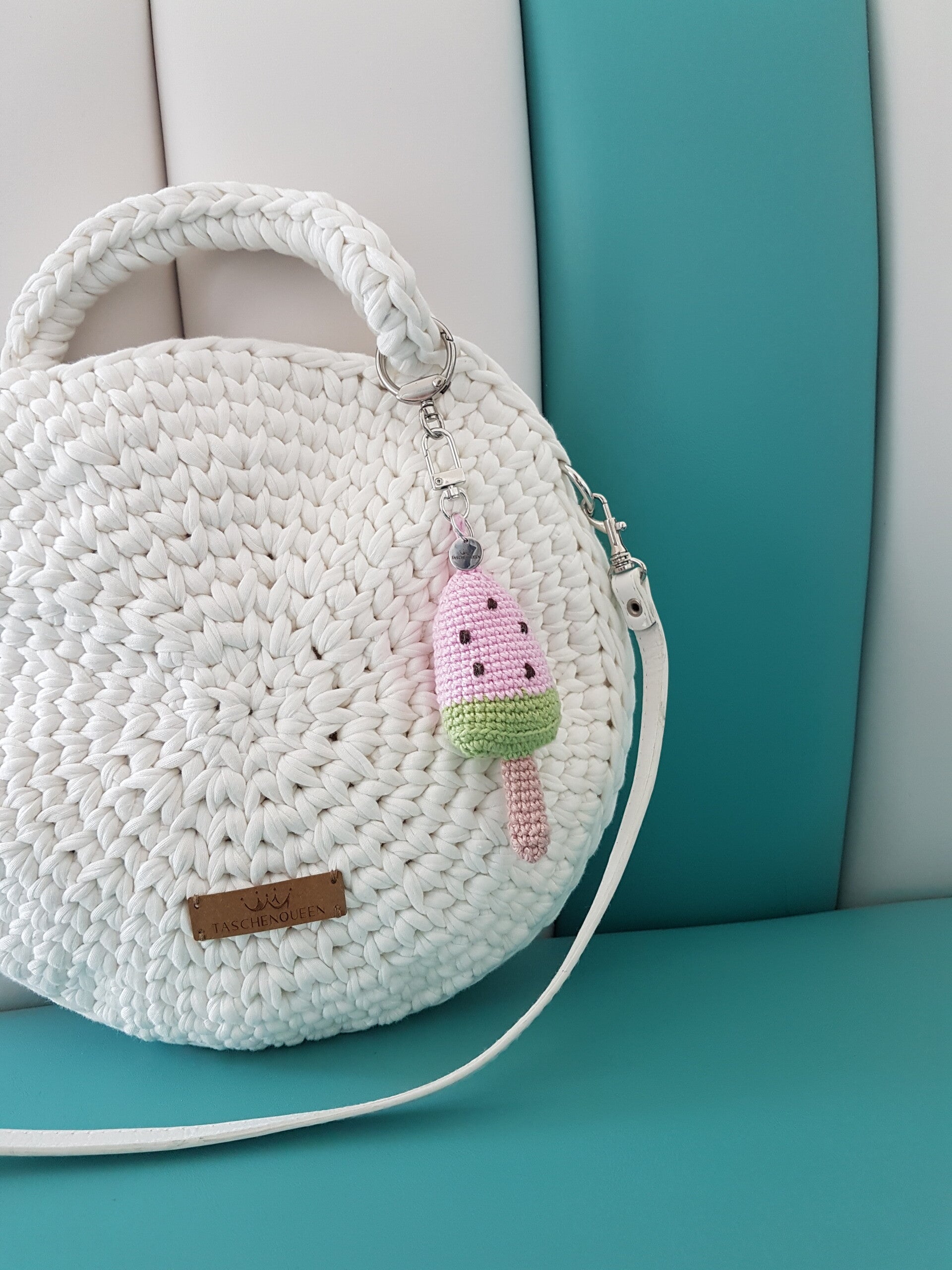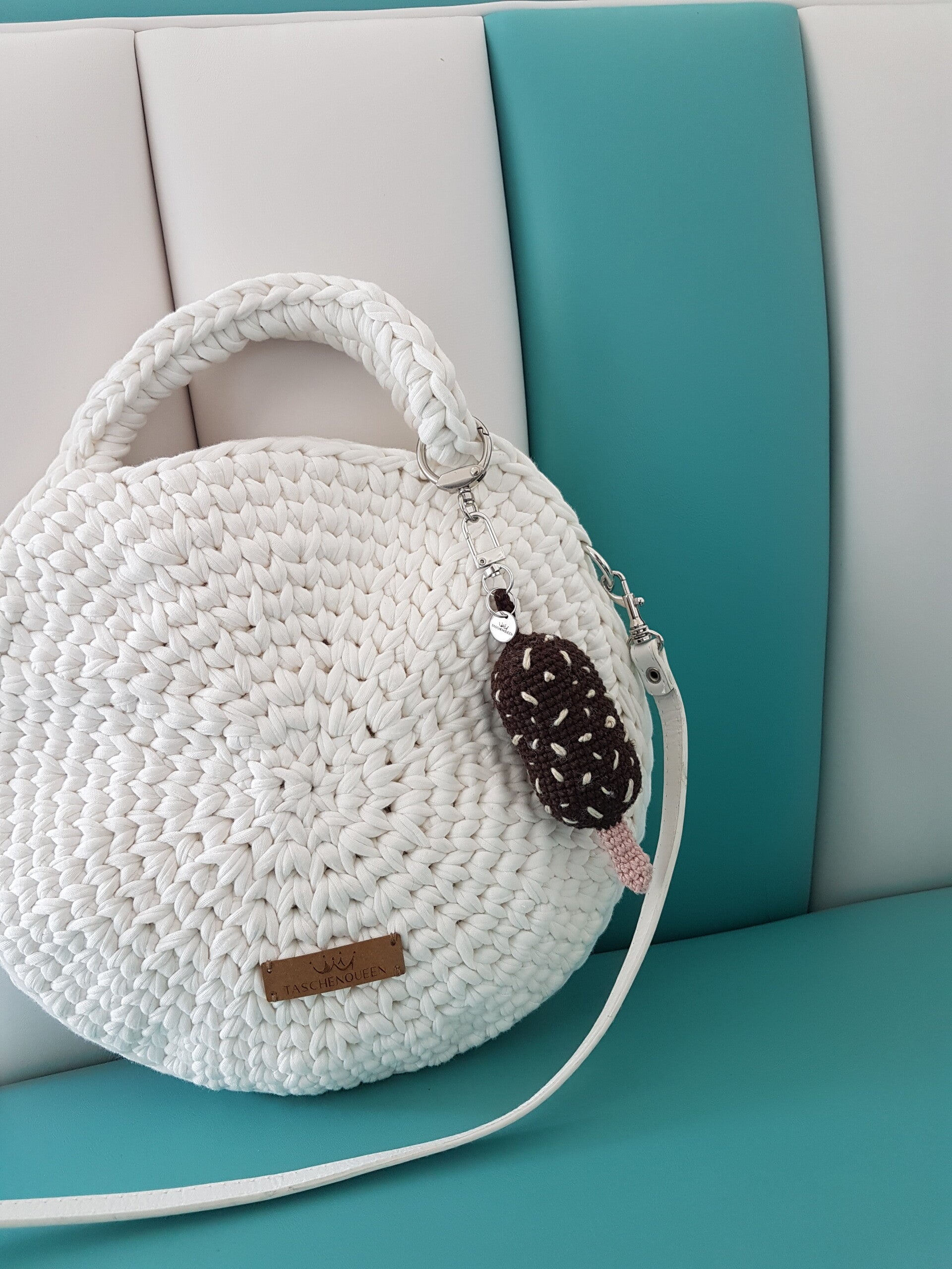 Der Taschencharm ist gehäkelt und handgemacht. Kleine Abweichungen zu den Fotos in Form und Farbe sind deshalb möglich.