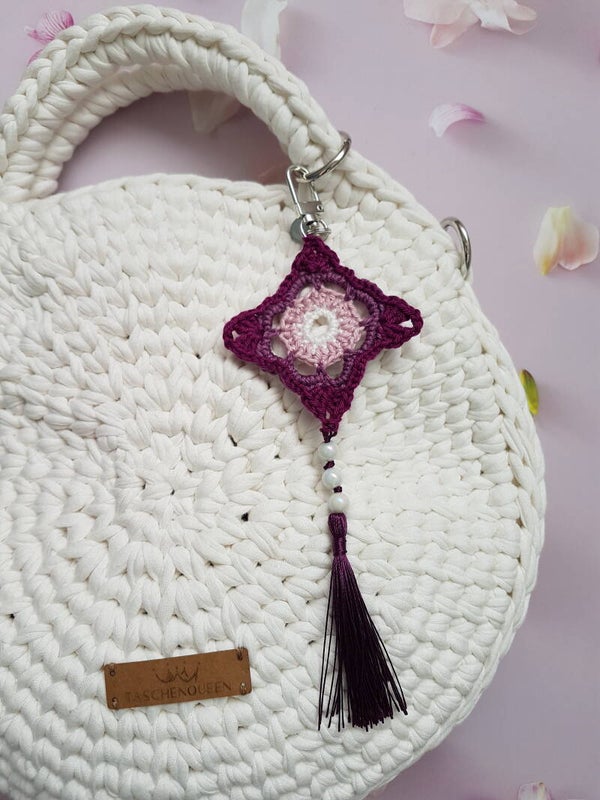 Der Taschencharm ist gehäkelt und handgemacht. Kleine Abweichungen zu den Fotos in Form und Farbe sind deshalb möglich.