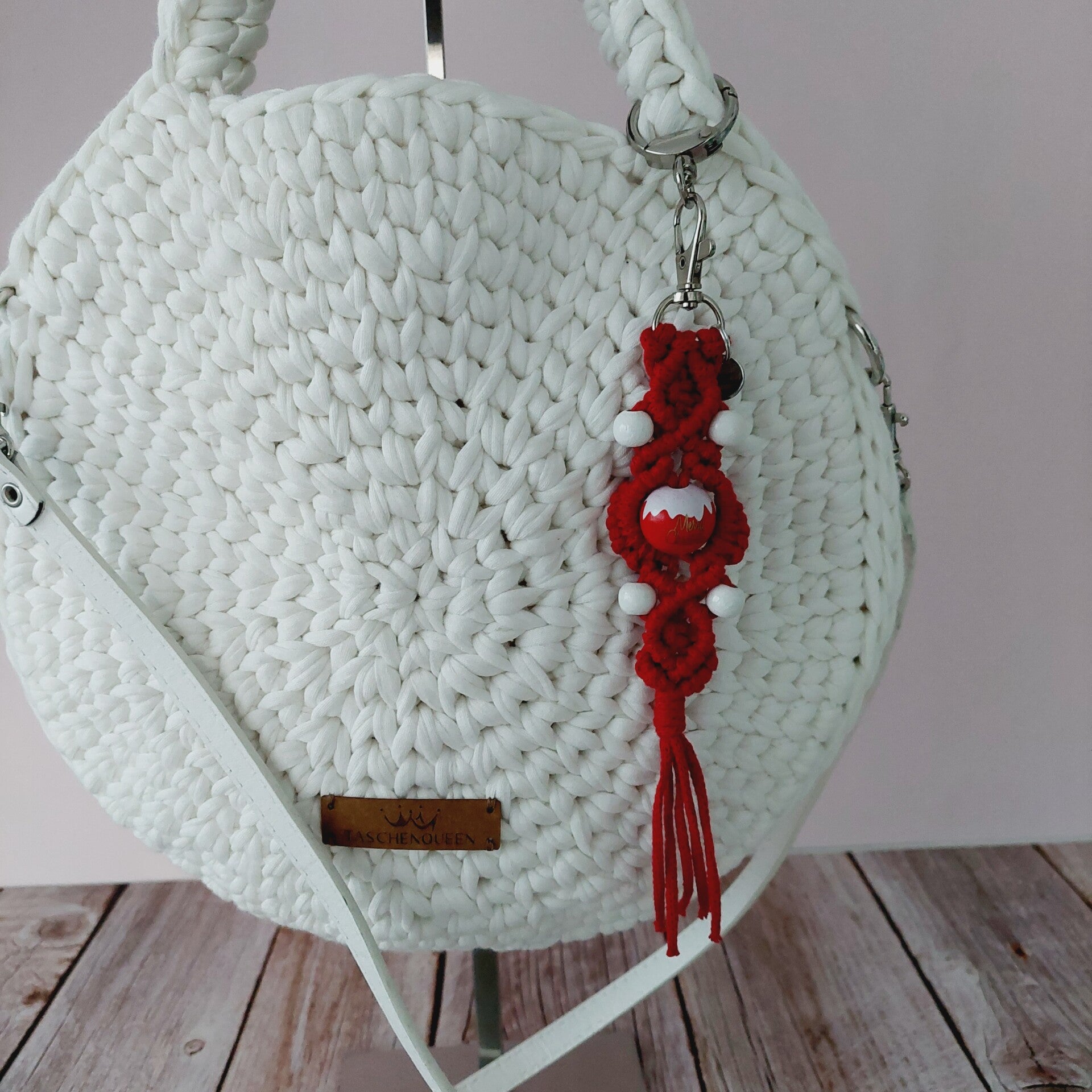 Der Taschencharm ist geknüpft und handgemacht. Kleine Abweichungen zu den Fotos in Form und Farbe sind deshalb möglich.