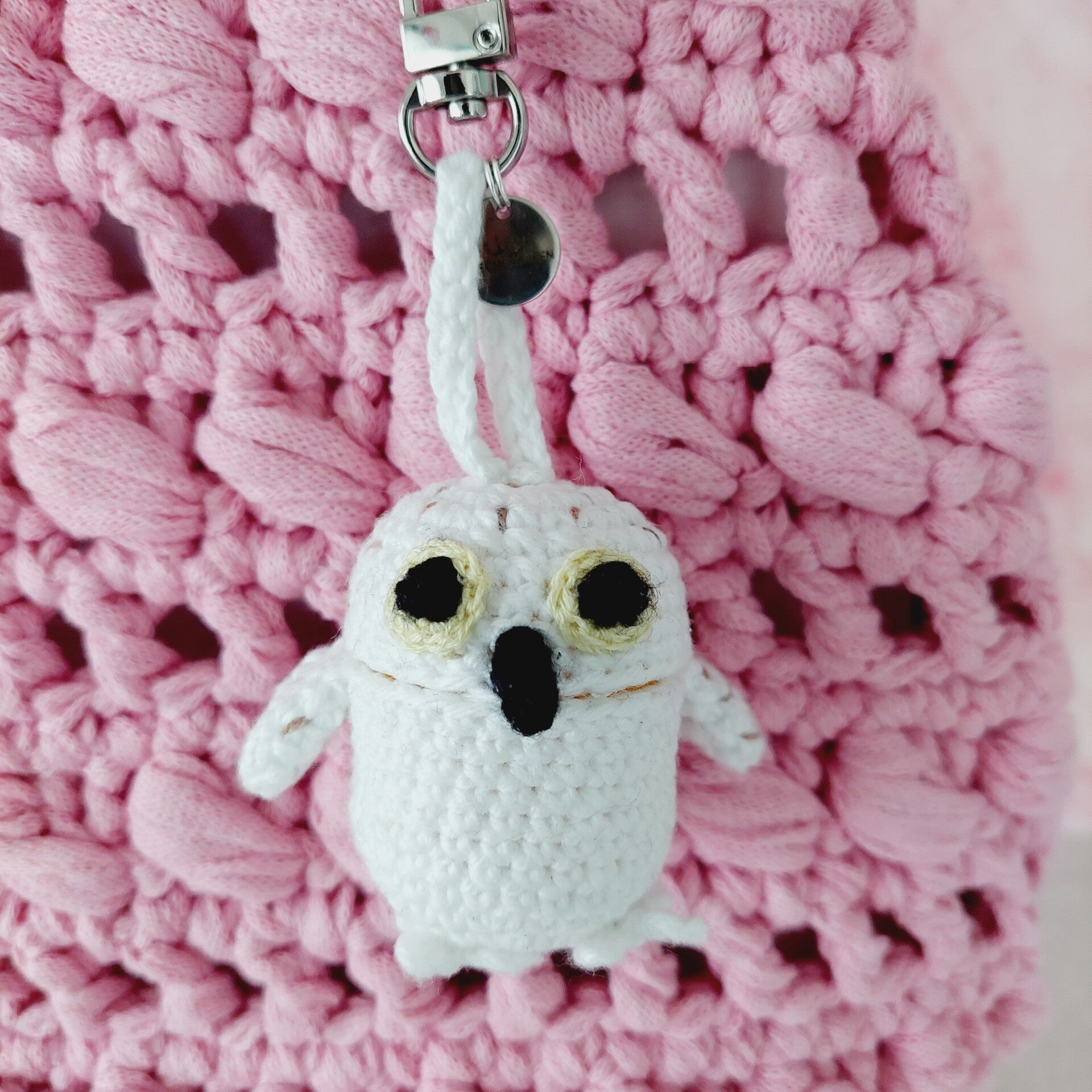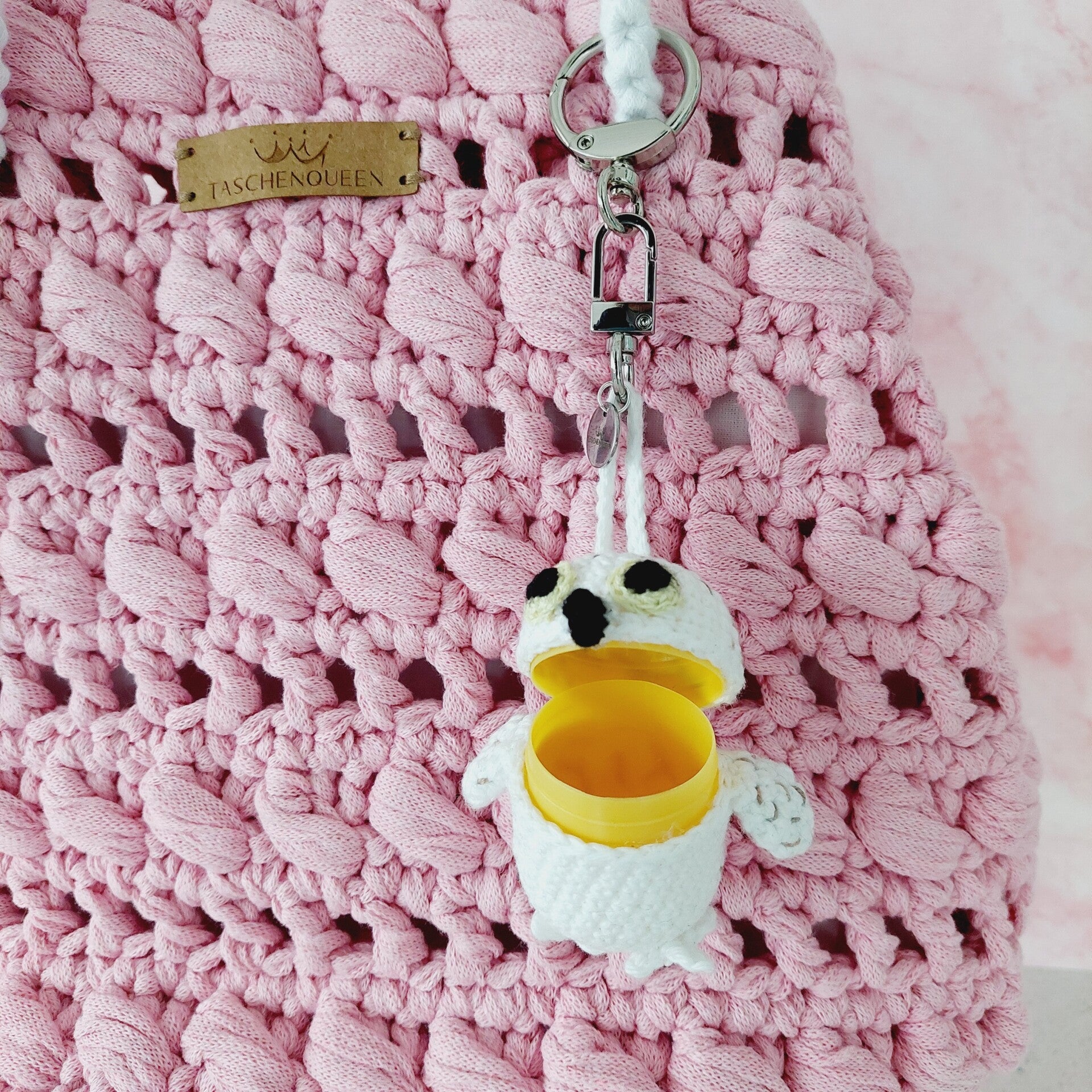 Der Taschencharm ist gehäkelt und handgemacht. Kleine Abweichungen zu den Fotos in Form und Farbe sind deshalb möglich.
