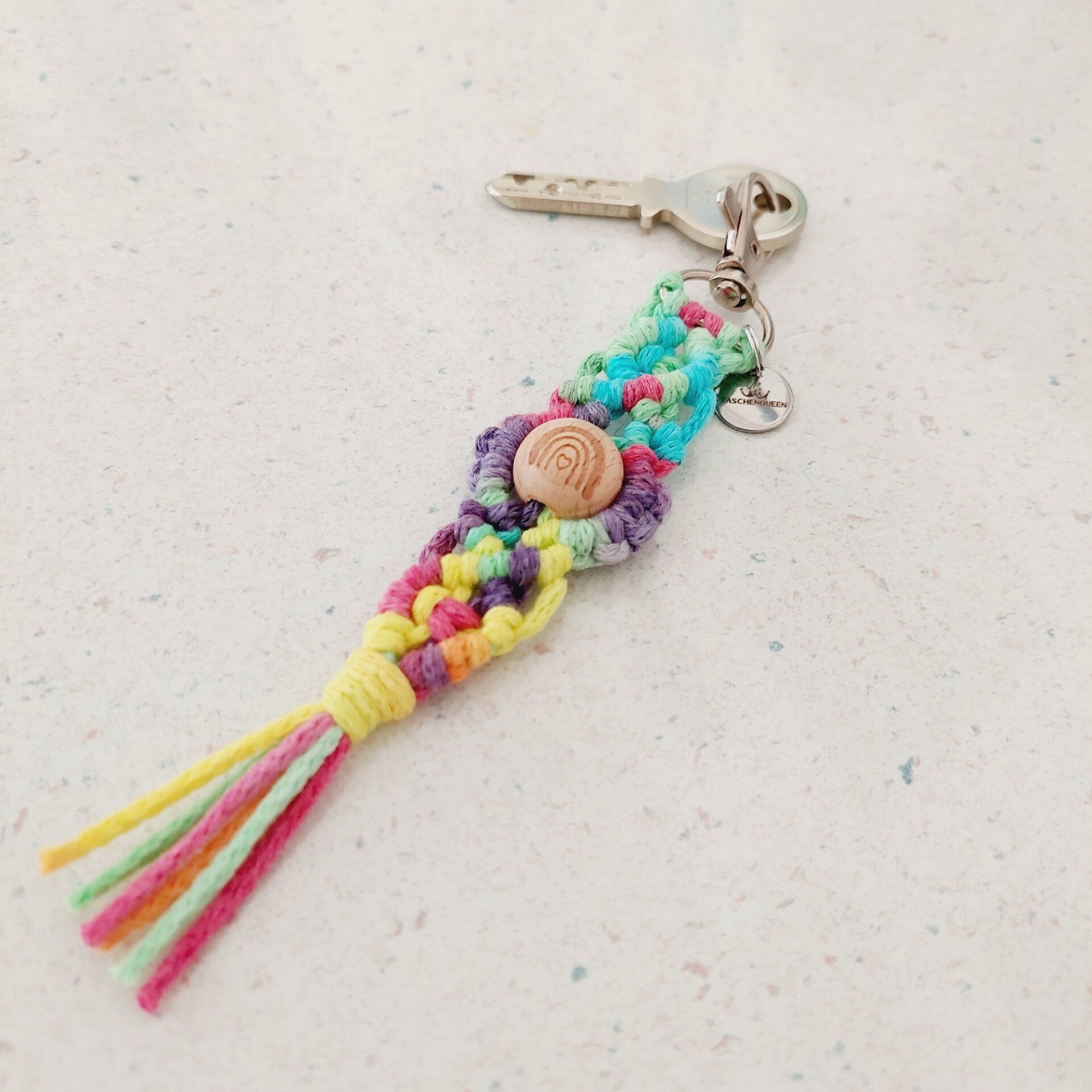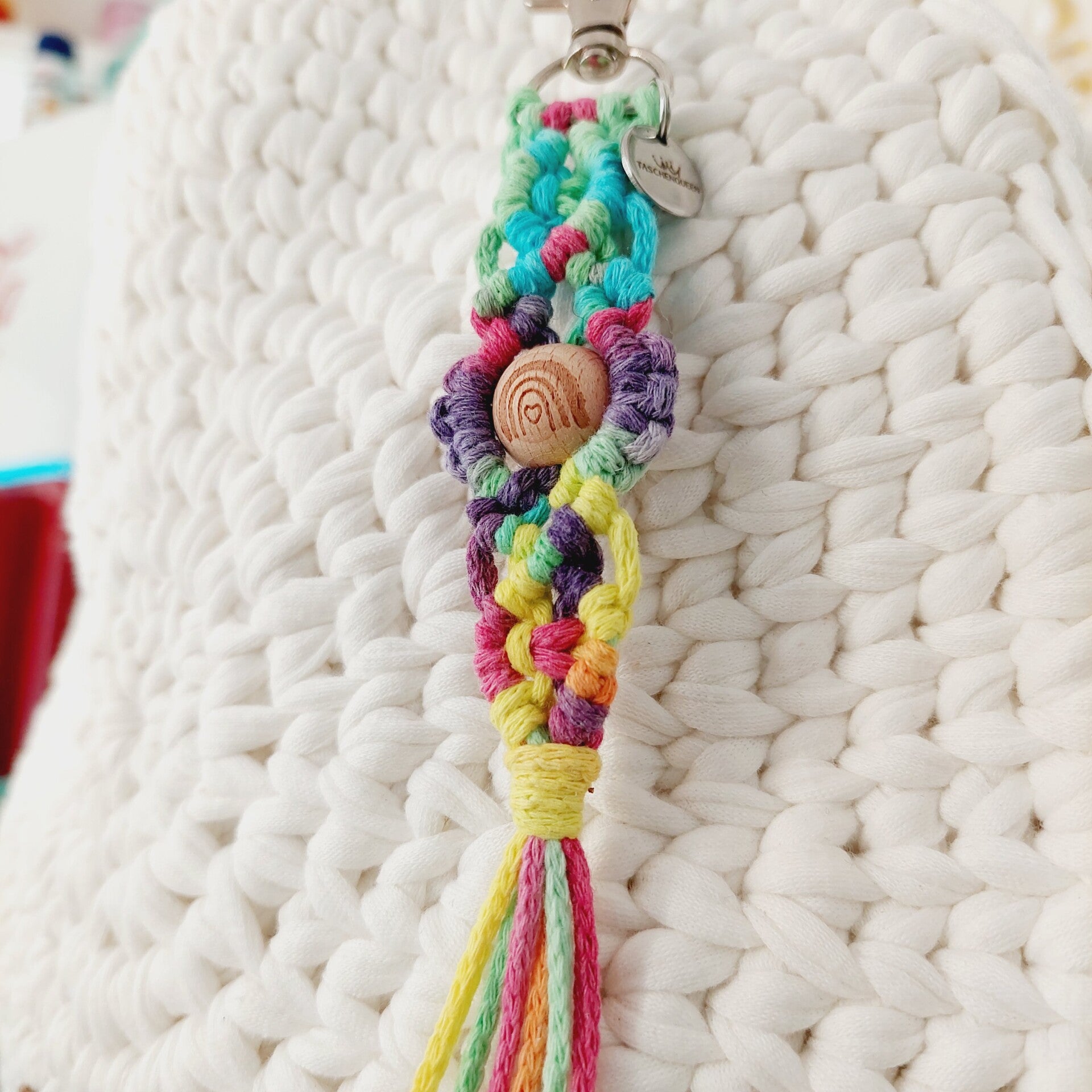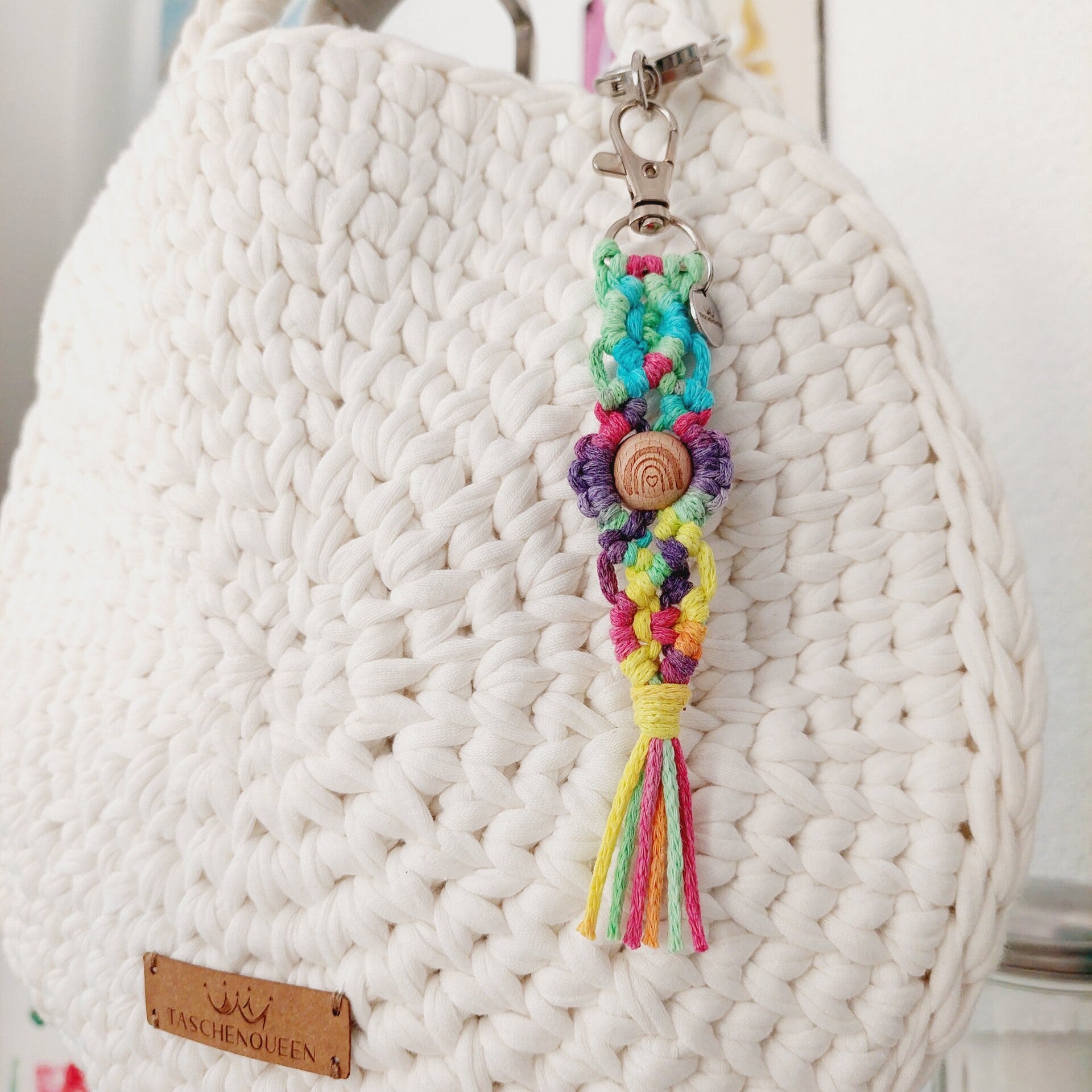Der Taschencharm ist geknüpft und handgemacht. Kleine Abweichungen zu den Fotos in Form und Farbe sind deshalb möglich.