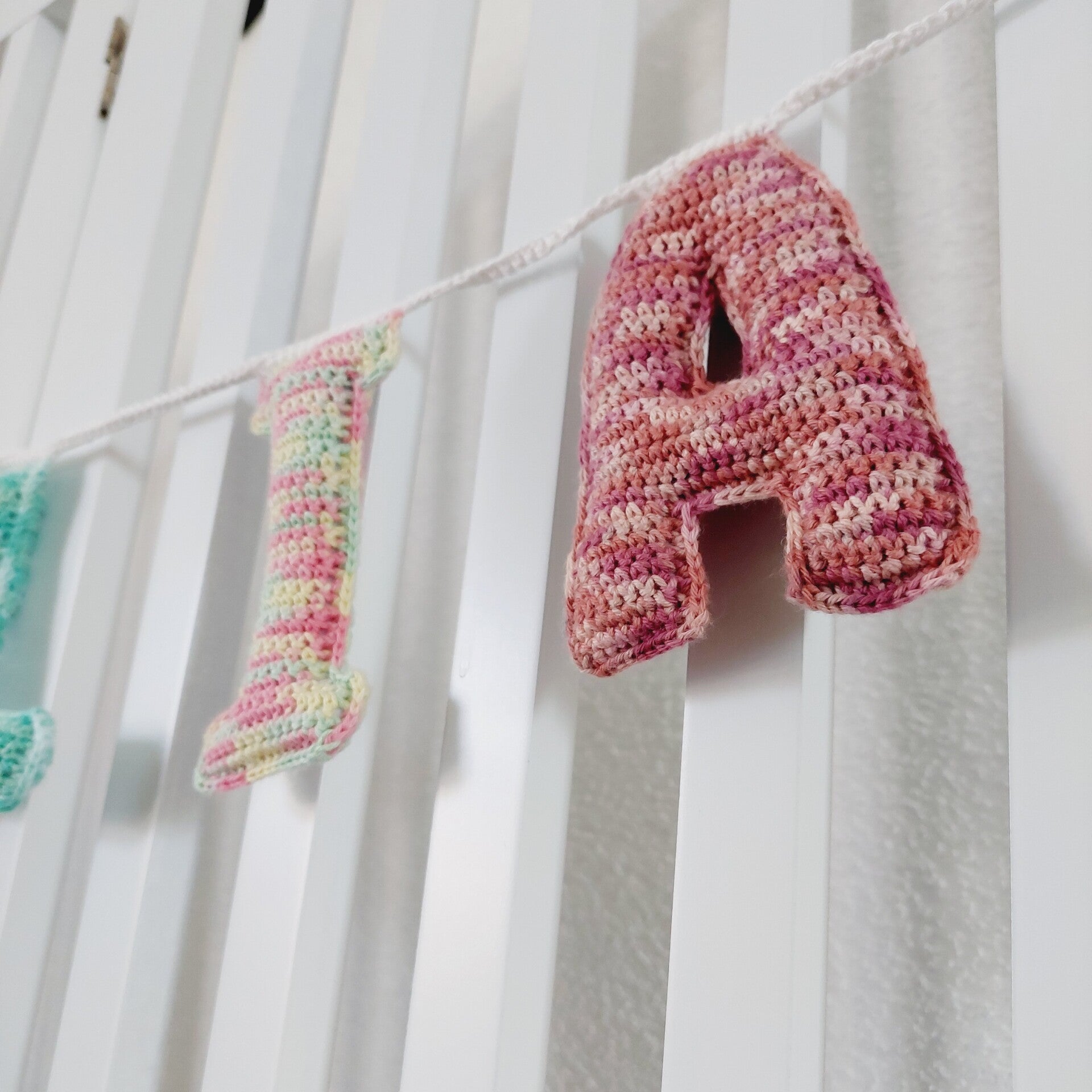 Die Namenskette ist gehäkelt und handgemacht. Kleine Abweichungen zu den Fotos in Form und Farbe sind deshalb möglich.