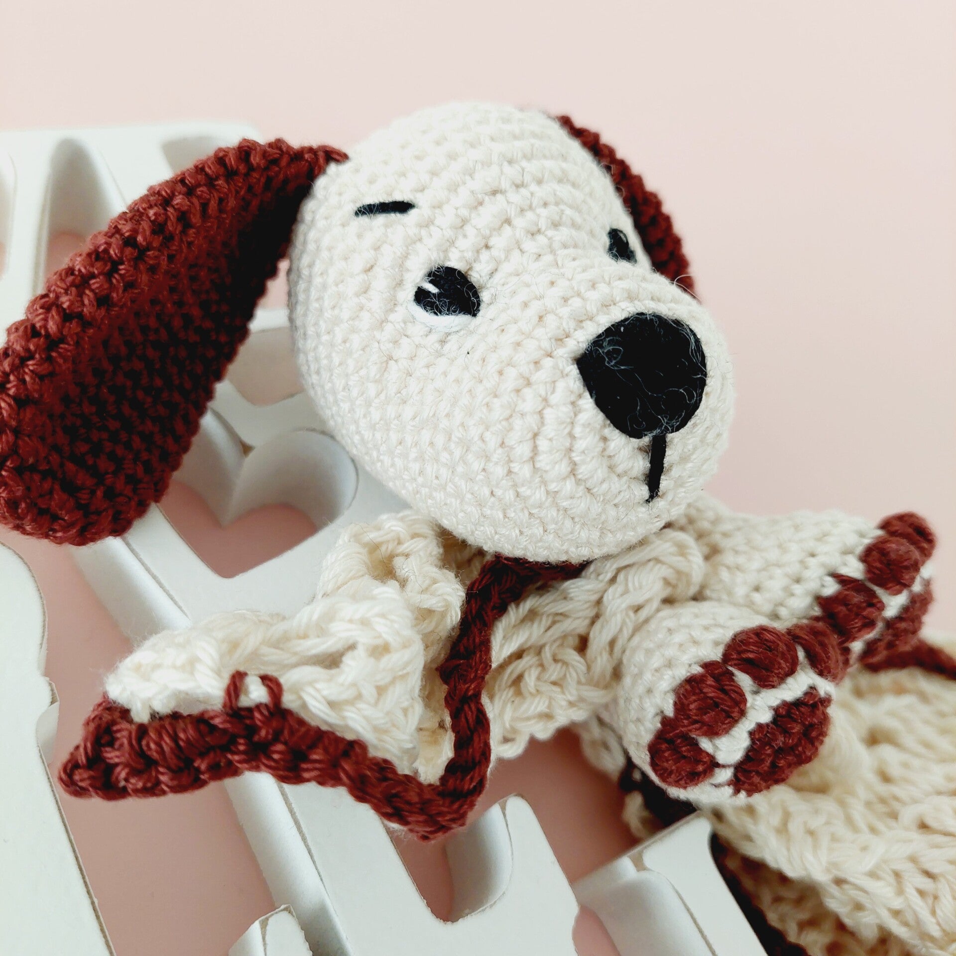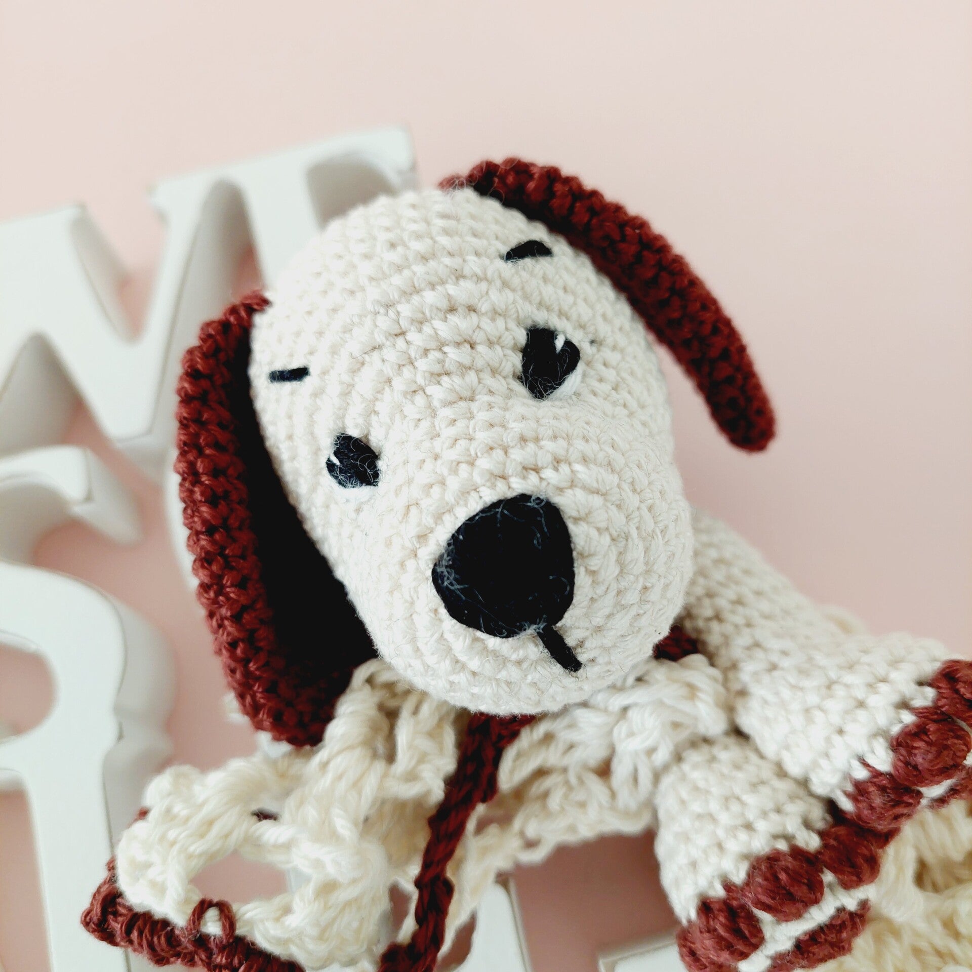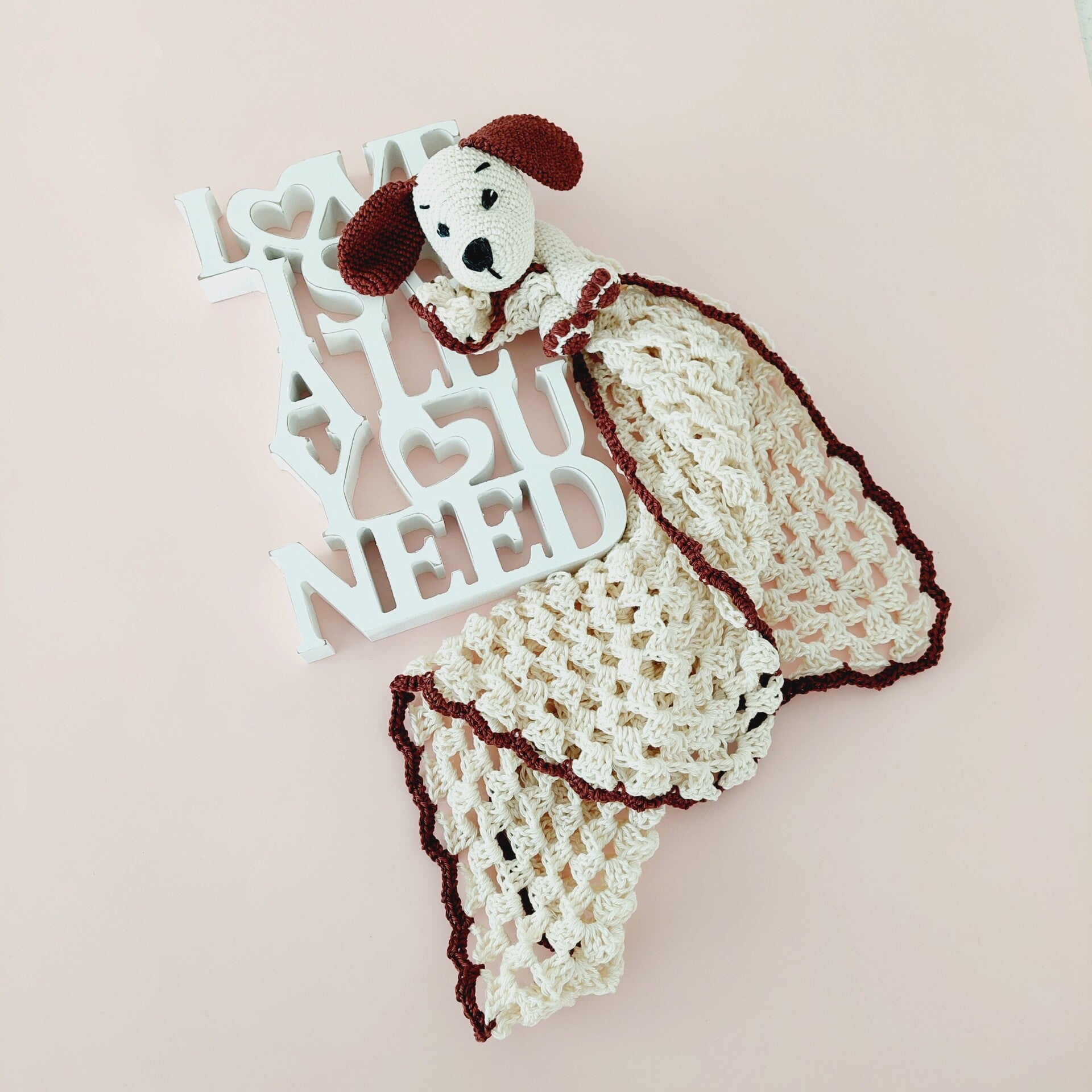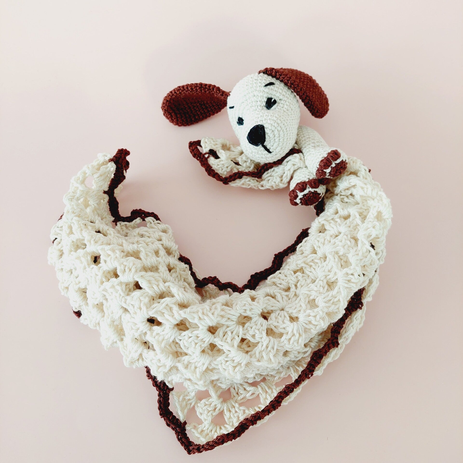 Das Schmusetuch und der Hunde-Oberkörper sind gehäkelt und handgemacht. Kleine Abweichungen zu den Fotos in Form und Farbe sind deshalb möglich.