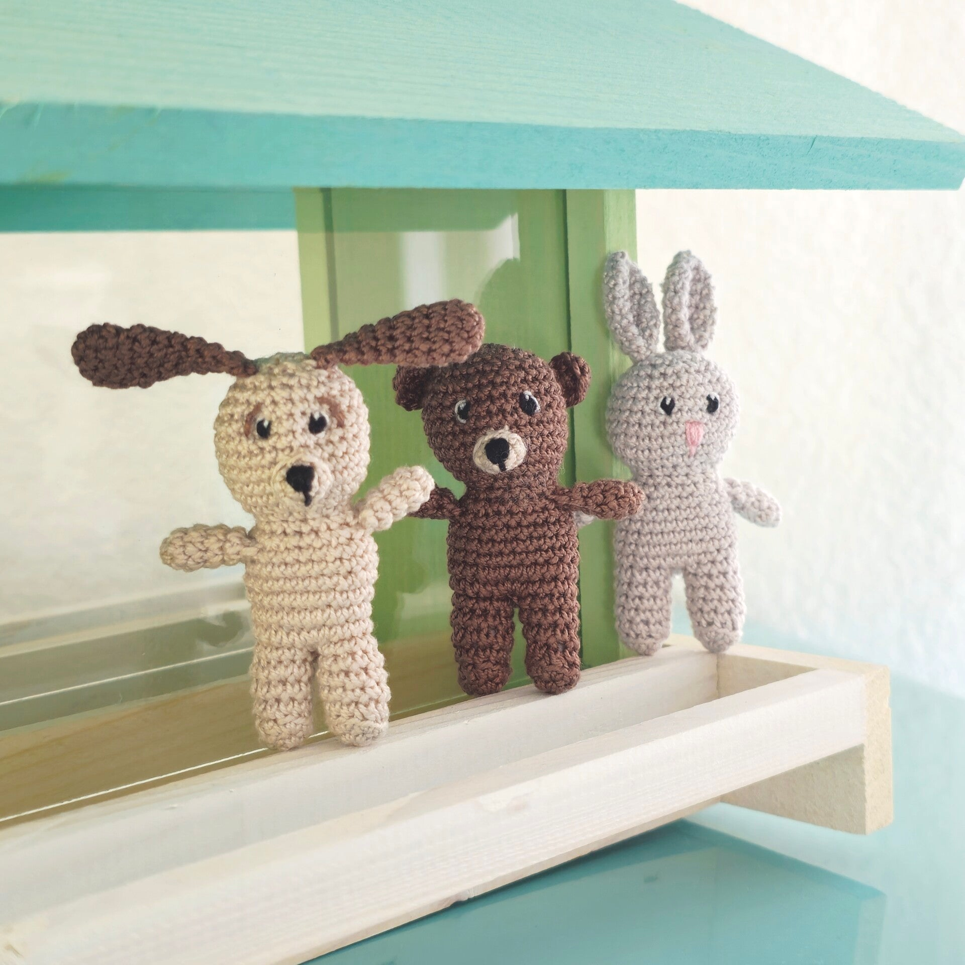 Die kleinen Freunde sind nach einer Anleitung von Alter Ego Crochet gehäkelt und handgemacht. Kleine Abweichungen zu den Fotos in Form und Farbe sind deshalb möglich.