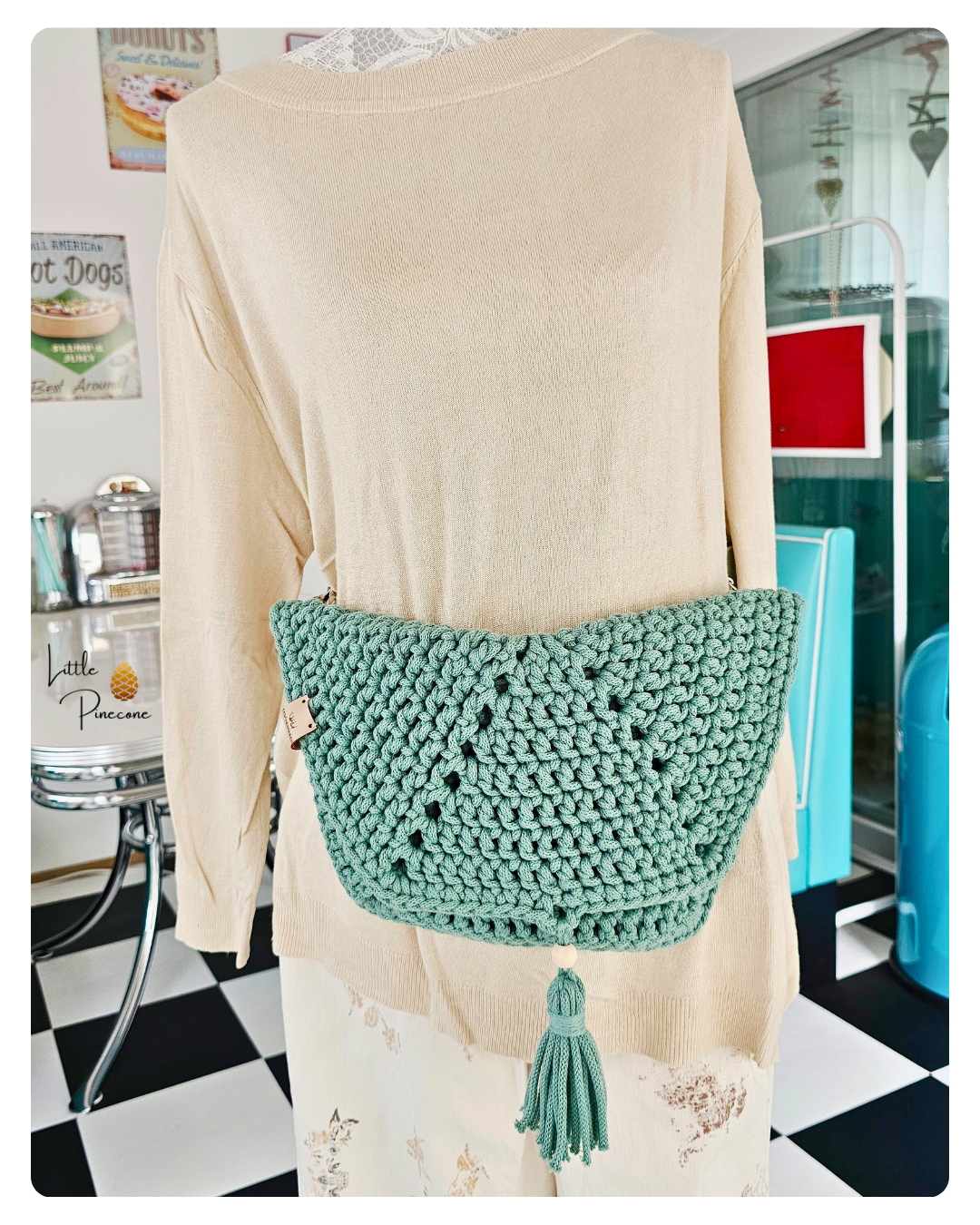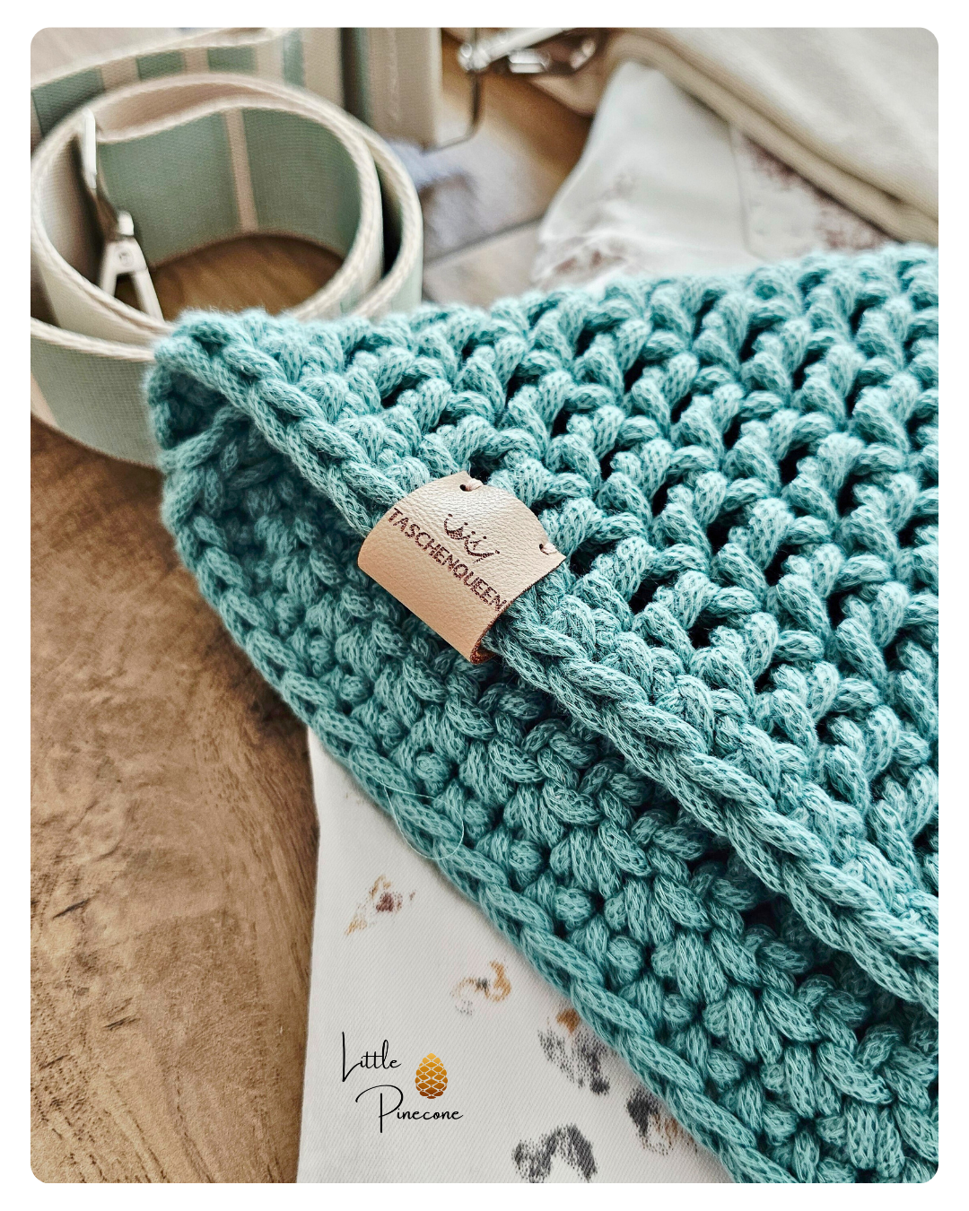 Die Tasche ist gehäkelt und handgemacht. Kleine Abweichungen zu den Fotos in Form und Farbe sind deshalb möglich.